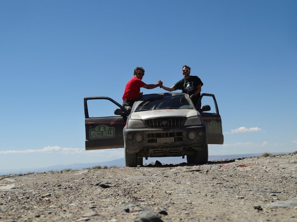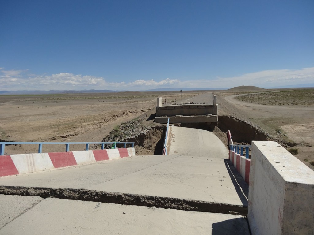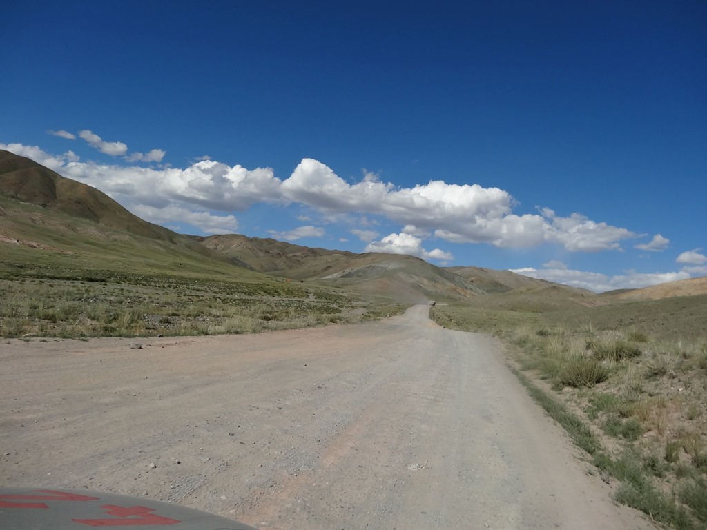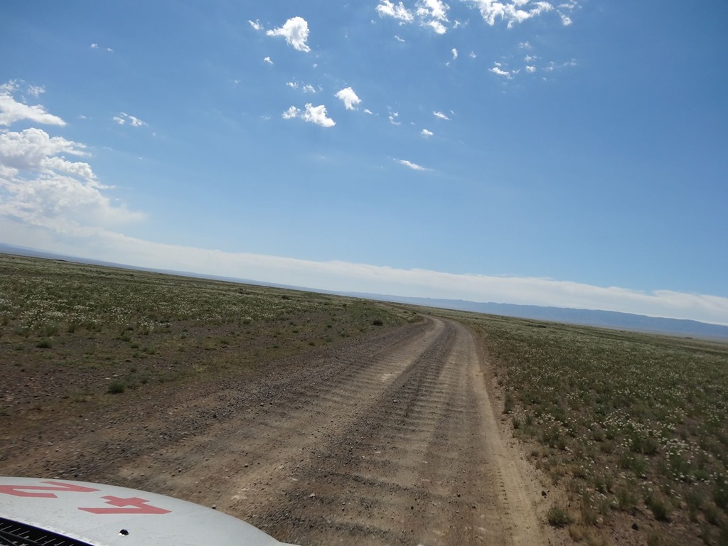 Dieses Wellblech kommt in unterschiedlichsten Ausprägungen daher und bedeutet mehr oder weniger extremes Rütteln und Schütteln. Das Gegenmittel dazu ist Speed, um quasi auf den Wellenkronen obenauf zu bleiben. Leider ist es nun sehr Autoabhängig, bis zu welcher Wellblechtiefe man noch obenauf fliegen kann – ist man nicht obenauf, muss man dann mit der Geschwindigkeit untendurch d.h. so ca. 10-15 Kmh und durchschaukeln. Allerdings gibt es hier durchaus recht fähige Fahrzeuge und wir habe bei einer der übelsten Pisten einen Toyota Landcruiser mit sicherlich gut 100 Sachen (also die Passagiere und Fracht innendrin nicht mitgerechnet, sonst wären’s 150 gewesen) vorbeifliegen sehen. Und das ist dann auch der kritische Punkt – weil man effektiv etwas fliegt, reagiert das Auto auch zuerst wie in Flugzeug und gleitet dahin – später dann steckt man brutal in den Wellen ein und wird zusammengestaucht. Daneben gibt es aber auch noch die Piste Malifiziosus – gekennzeichnet durch die Absenz von Wellblech und vermeintlich guten Konditionen, wobei sich aber alle paar hundert Meter eine brutale Bodensenke versteckt – typischerweise erahnbar, wenn man sich vorstellt, wo Wasser abfliessen müsste, wenn es mal regnet. Ähnlich fies ist die Trollpiste – bei welcher immer mal wieder grosse, spitzige Steine im Weg lieben – denn die Trolle die hassen die Reifen und die Reifen hassen die spitzigen Steintrolle, weshalb man die zwei voneinander fernhalten sollte. Eher selten in der Mongolei sind die Sandpisten – jedenfalls auf unserer Route. Wir haben aber einen Untertyp davon befahren und zwar wurde für das Trassee der neuen Teerstrasse ein ordentlicher Aufbau gemacht, wobei als mittlere Schicht auch Sanderde eingebracht wurde – da kam schon fast Saharafeeling auf unser Terios hatte richtig Freude – allerdings war das befahren des Trassee wohl noch nicht vorgesehen und so zog sich alle 500 Meter ein mannshoher Erdwall quer über die Piste, was meist zu einer kleinen Driftkurve mit anschliessender Durch- / Überfahrung der seitlichen Erdwälle führte – im Zick Zack um den Wall rum und dann wieder beschleunigen und Sandpiste heizen. Mit all dem Sand gefiel das dem Terios so sehr, dass er begann nach jeder Geradeausstrecke die ersten Lenkmanöver mit heftigem Quietschen zu bejubeln – ist halt auch ein Naturbursche! Später in der Mongolei haben wir dann auch noch Graspisten und weitere interessante Sorten Fahrbahn kennengelernt – aber dazu später einmal mehr.