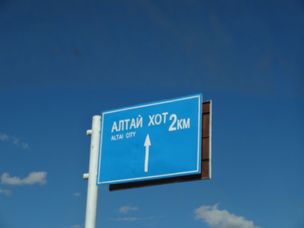 Nach harter Navigation und einigen Stunden Pistenrumpelei tauchte dann endlich die Bestätigung auf, dass wir richtig gefahren waren (man erinnere sich, die Entscheidung, welche Abzweigung richtig sein würde, hatten wir ja schon am Vortag treffen müssen. Sehr sinnvoll also, dass es unterwegs nie Schilder hat, man aber bevor man den Flughafen erspäht, darauf hingewiesen wird, dass man in Altai ist. Könnte ja sonst noch passieren, dass jemand zum falschen Flughafen fährt!