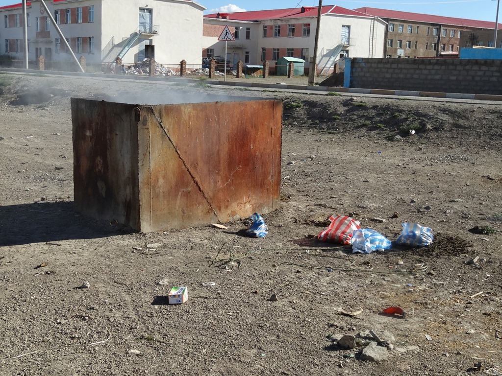 Die Abfallproblematik ist dermassen omnipräsent, dass es übrigens ratsam ist, immer auf der Strasse selbst oder auf der Piste anzuhalten, weil überall sonst die Erde mit Scherben von Vodka Flaschen gezuckert und mit sonstigem Müll übersäht ist. Vodka & Co scheinen denn auch ein weiteres Problem zu sein – auf der einen Tarmac Strecke – lag alle 10 Km eine frische, leere Bierdose auf der Fahrbahn – wir müssen annehmen, dass das Auto ganz schön Durst hatte und mit alternativem Treibstoff betrieben wurde. Dieser alternative Treibstoff wird auch der Grund dafür sein, dass man in jedem Mini-Markt ein ansehnliches Arsenal an Alkoholika kaufen kann – oft sind sogar auch ein paar Flaschen Wein dabei, was – wenn man Fondue kochen will – ganz praktisch ist.