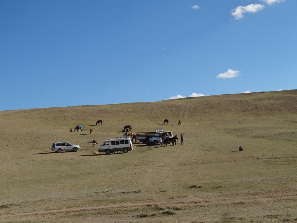 raus aus Altai – Richtung Bayanghokor – von da aus sollte der Weg dann wieder einfacher sein. Beim Ortsausgang der Standard: Tankstelle mit Monument / Dorfschild. Daneben gab’s offensichtlich ein paar Reitwettkämpfe und die letzten Pferde wurden auf die Transporter gehievt – auch hier werden die Rösser also zwischendurch mal gefahren.