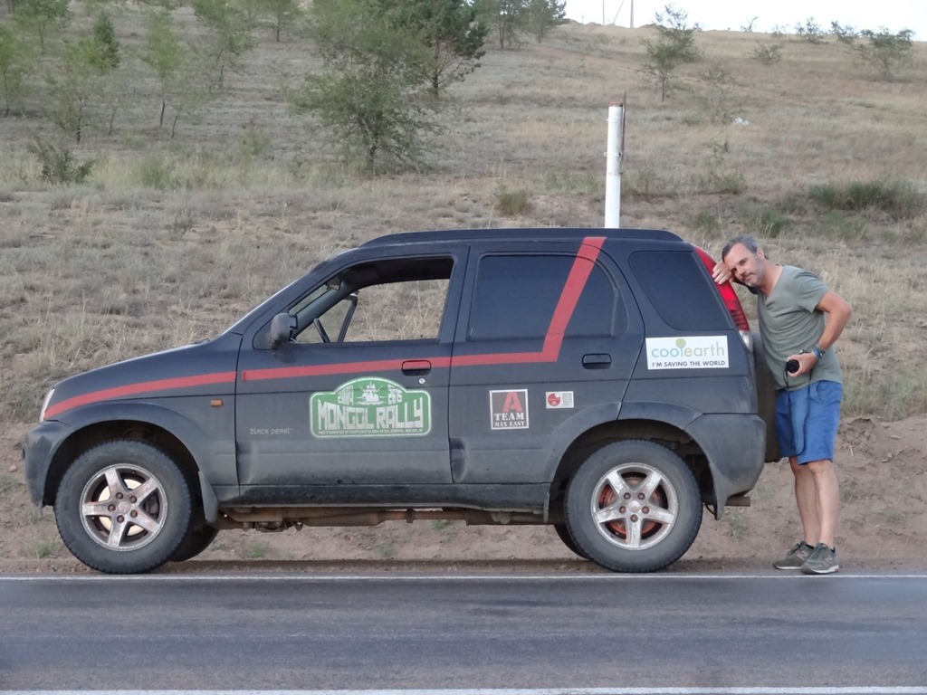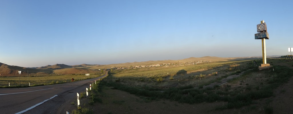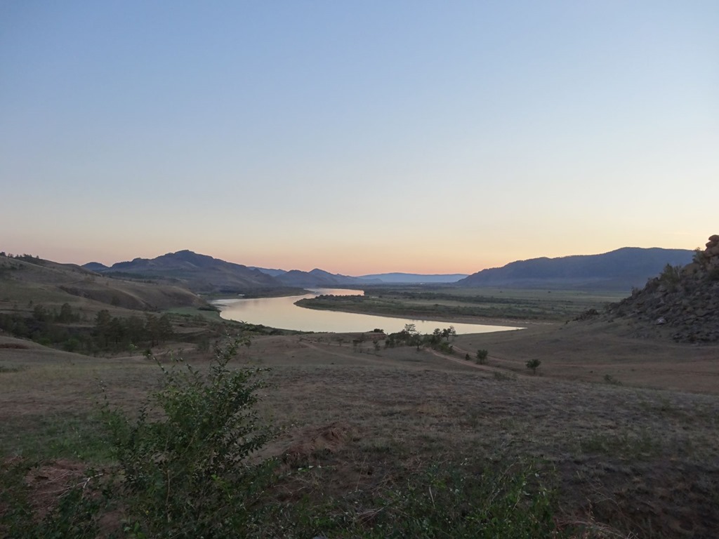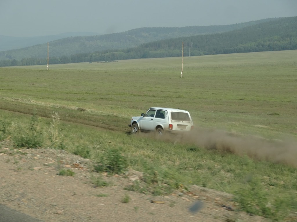 Und so konnten auch weder die sehr spezielle Sonnenuntergangsstimmung – wegen dem vielen Staub in der Luft sah das manchmal aus wie Bodennebel mit schräg einfallenden Sonnenstrahlen – noch die immerhin bekannte Rüttelpiste, die idyllischen russischen Seen und Flusstäler, einfach gar nichts konnte diesen angestauten Frust bekämpfen. Und weil wir immerhin schon wieder 3h ostwärts gefahren waren, mussten wir uns auch wieder 3h zurückschleppen, sinnierend, weshalb diese Autogeschichten denn immer so kompliziert sein müssen.