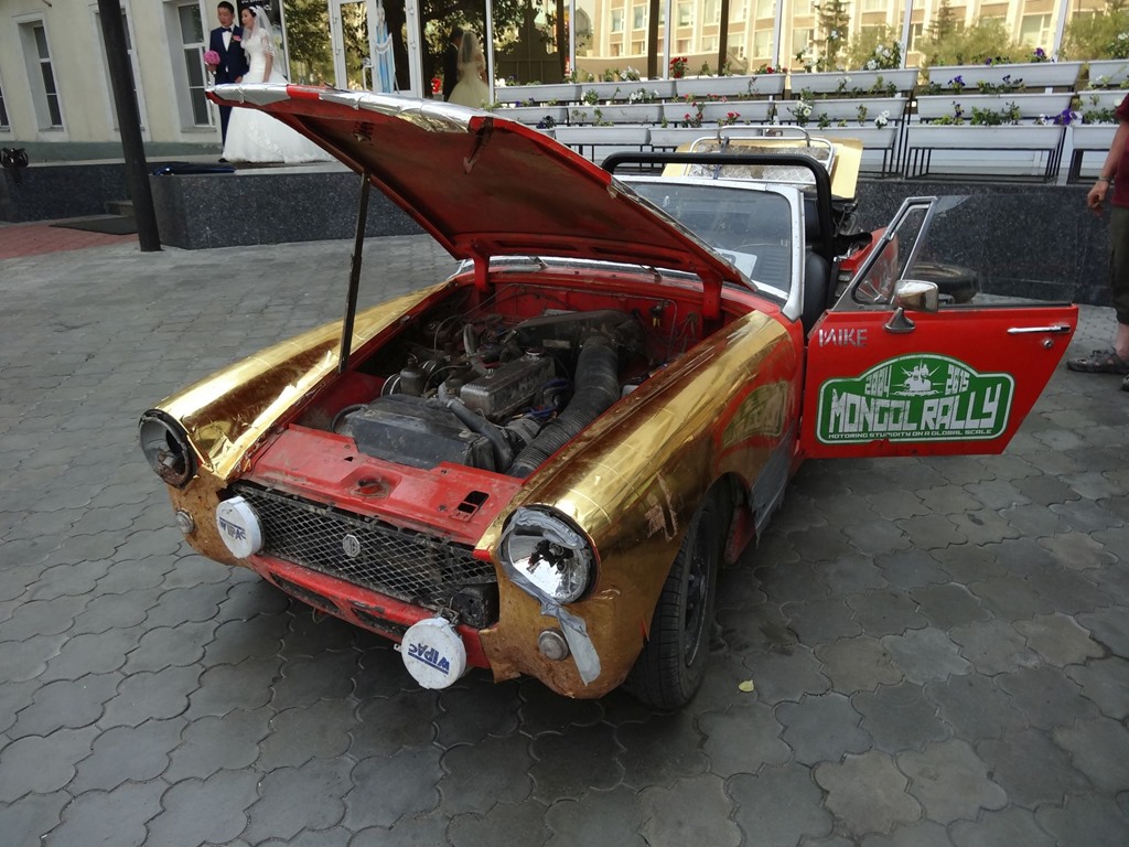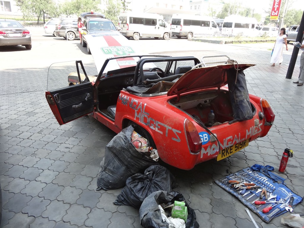 Allzuviel zu berichten gibt es nicht mehr – Ziel dieses Reiseberichts ist ja – die Beschreibung der Erfahrung Russlands im wörtlichen Sinne und weil wir heute nix mehr zu fahren hatten, gibt’s auch nur wenige Erkenntnisse. Z.B. dass man auch mit einem MG Midget von London durch die Mongolei bis nach Ulan Ude fahren kann – allerdings nur unter sehr grossen Opfern und mit einem Wagen ankommend, den man nicht nur als schwer überholungsbedürftig bezeichnen muss, sondern bei welchem grad noch ein Frontscheinwerfer funktioniert und der Bremsdruck nur mit pumpen erhalten werden kann – da wird’s dann irgendwann auch etwas gefährlich. Aber geschuftet hat dieses Team schwer – gestern beim Eintreffen im Churchill sahen die zwei aus wie Scheintote, welche man durch den Strassenstaub gezogen hatte – 10.5 Stunden an der Grenze und jeweils alle paar Dutzend Kilometer eine Panne beheben – Respekt – dass sie es trotzdem geschafft hatten und nun natürlich das Star-Fotosujet bei den Passanten waren.