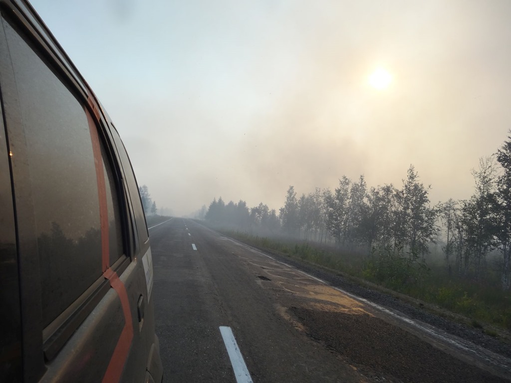 Danach tuckerten wir weiter, vorbei an mächtig qualmenden Waldbränden – unglaublich – gestern auf derselben Strecke war noch alles ok – jetzt wohl nach der Samstagabendparty oder dem Sonntagsbrunch stand plötzlich die halbe Steppe in Flammen und mächtige Rauchwolken verdunkelten die Sonne und uns wohl auch die klare Erkenntnis, denn