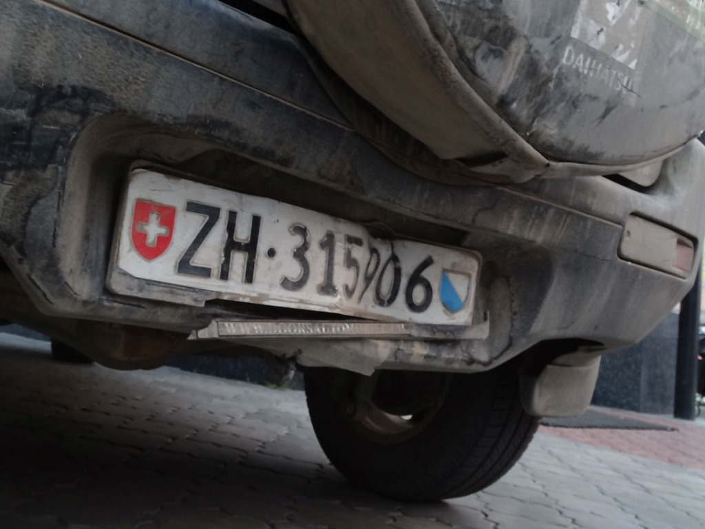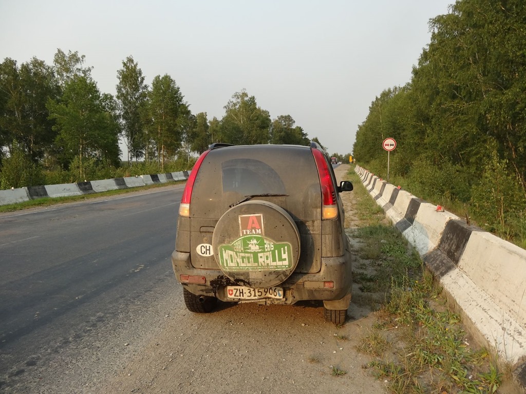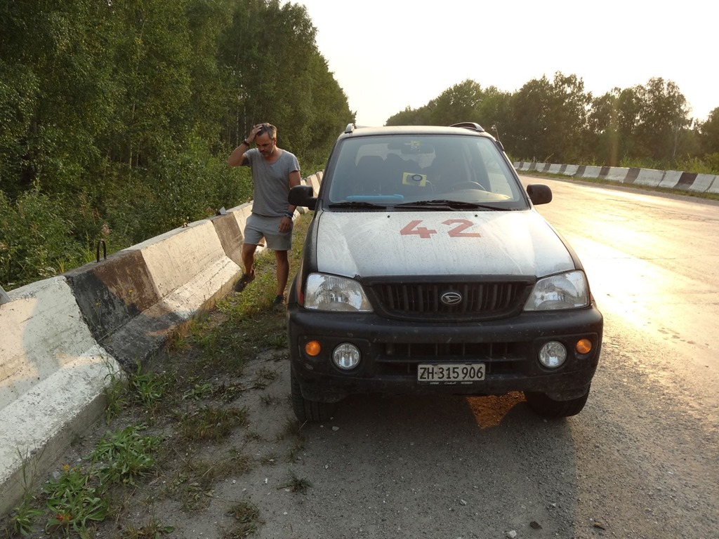 etwas später fuhren wir – einmal mehr – an einem Autostopper wegen eines offensichtlich pannierten (das hat mit Cordon Bleu also nix zu tun) Autos vorbei. Hannibal wollte mal noch jemandem helfen und ihn mitnehmen, doch B.A. Barracus befand, dass wir schon in der Mongolei zweimal geholfen hätten und nun nichts mehr für unser Kharma tun müssten – eine schwerwiegende Fehlentscheidung aber wir waren ohnehin schon vorbei und die Verständigung wäre mit Sicherheit schwierig gewesen. Jedenfalls cruisten wir entspannt mit 80 Kmh dahin – noch ca 120 Km lagen vor uns, danach die Szene im Churchill checken, das übliche halt, doch plötzlich knallte es und unser treuer Terios Vandura wurde nach vorne katapultiert – unglaublich – obwohl Hannibal den rückwärtigen “*ç%*ç*&*”*ç% immer mal wieder im Spiegel beobachtet hatte und bewusst nicht allzu schnell fuhr, damit dieser hätte überholen können, knallte uns der doch voll ins Heck. Und machte sich danach sofort im Zick-Zack Kurs aus dem Staub – eine wartende Baustellenkolonne noch rechts im Gelände umfahren und weg war er. Hannibal suchte, nachdem wir standen noch die Kamera um den Kerl mit dem Zoom zu erwischen – doch vergeblich. Danach Schadenaufnahme: Wir hatten Glück im Unglück, das Rattern beim Anhalten war bloss ein Plastikteil, welches sich in den Radkasten geschoben hatte und weil der Terios hinten das Reserverad aussen und darunter einen massiven Querträger hat, hat es den Bruchpiloten unter dem Reservereifen durch auf den Querträger abgeleitet und so ist zwar einiges verbogen, uns aber nichts passiert. Also tief durchschnaufen und weiterfahren – und den Spruch mit dem Plan den lassen wir – denn sosehr ja vor dem Strassenverkehr in Russland gewarnt wird – mit solchen Dingen spassen wir nicht! Und waren froh, einen cheesy Car zu haben und nicht z.B. den MG Midget – denn bei dem hätten wir nach der Kollision wohl dem Bruchpiloten gleich im Sitzen einen Ölwechsel machen können, weil der drübergeflogen wäre. Unglaublich da waren wir fast 13’000 Km ohne Probleme durchgefahren und auf dem letzten Prozent knallt’s – hätte nicht sein müssen.