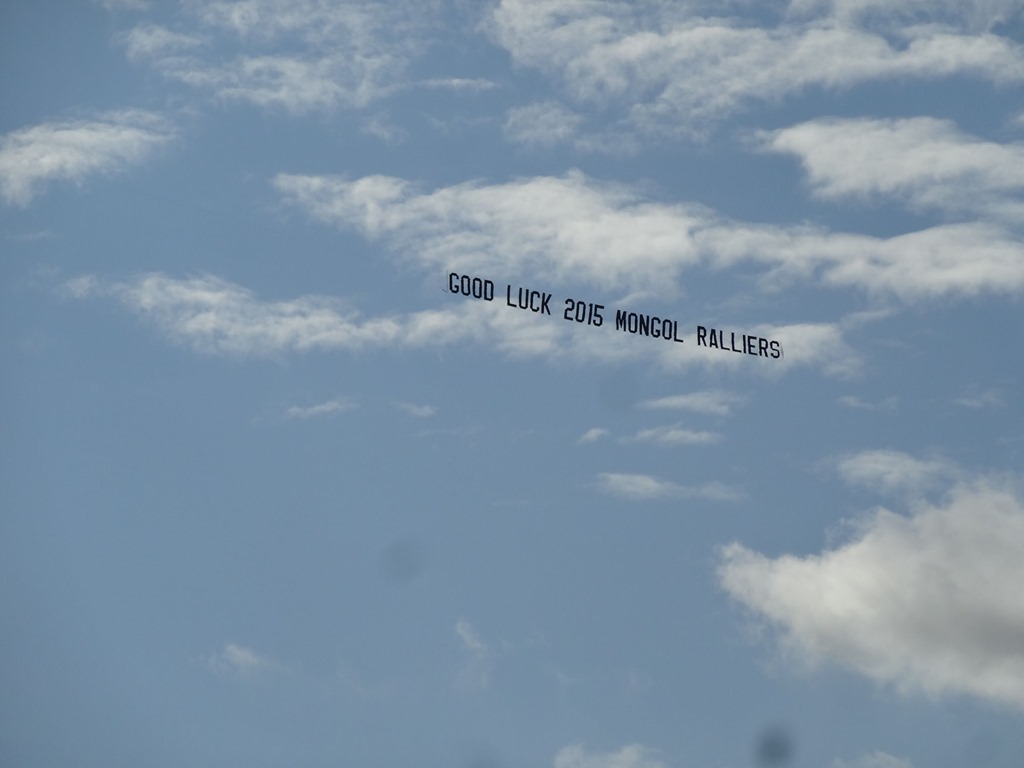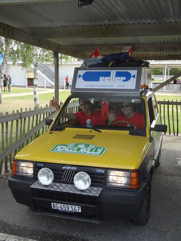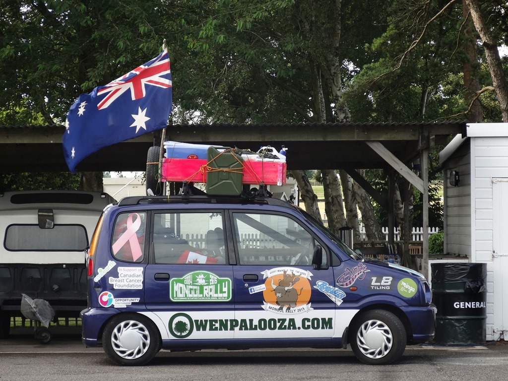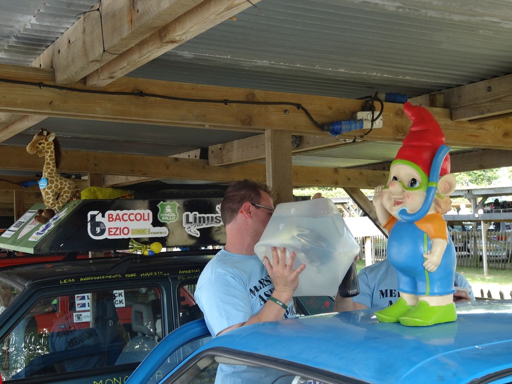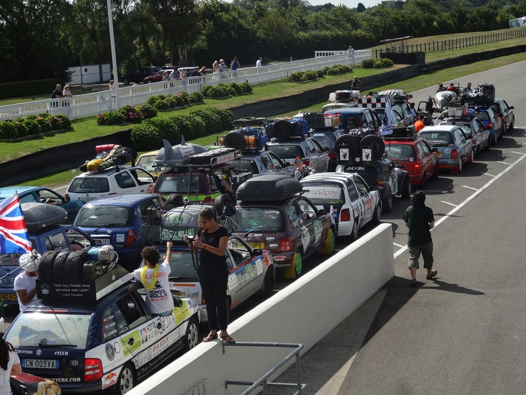 Nach einer bewegenden, formellen Ansprache des Gründers der Mongol Rally, welcher selbige als Student-Bieridee vor ca. 12 Jahren ins Leben gerufen hat und einigen Interviews, wobei auch the Face zu Wort kam – leider nur verbal und nicht visuell – denn seine Stärken sind Charaktergemäss schon in der bildlich expressiven Ausdrucksweise – allerdings muss man fairerweise festhalten, dass the Face immerhin einige fliessende Worte in gepflegtesten Züri-Oxford-Englisch ins Mikro flötete, wohingegen unsere Pandabärchen ihrem Klischee vorbildlich gerecht wurden und den Einsatz verschliefen… egal – der Start rückte näher und wir bekämpften die Nervosität mit einem weiteren Kaffee und einem Rundgang durch den Paddock.