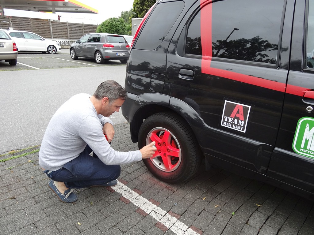 Danach wurde dann der ATU angelaufen und wir rüsteten uns mit einigen nicht unwichtigen Utensilien aus – so z.B. einem Graffittspray, damit wir endlich auch die Felgen auf A-Team trimmen konnten (immer wieder erstaunlich wieviele Fuss- oder Felgenfetischisten es geben muss – denn während es für die Rädli ja einige hundert Felgenvarianten gibt, so haben die Zylinderdeckelfetischisten schon weniger Spielraum – egal). Jedenfalls mussten wir hier zum ATU = Auto Teile Ungerer, weil’s den in Polen nicht mehr gibt – dem Klischee entsprechend würden wir jetzt ventilieren, dass die das nicht brauchen, weil sie halt grad ganze Autos importieren).