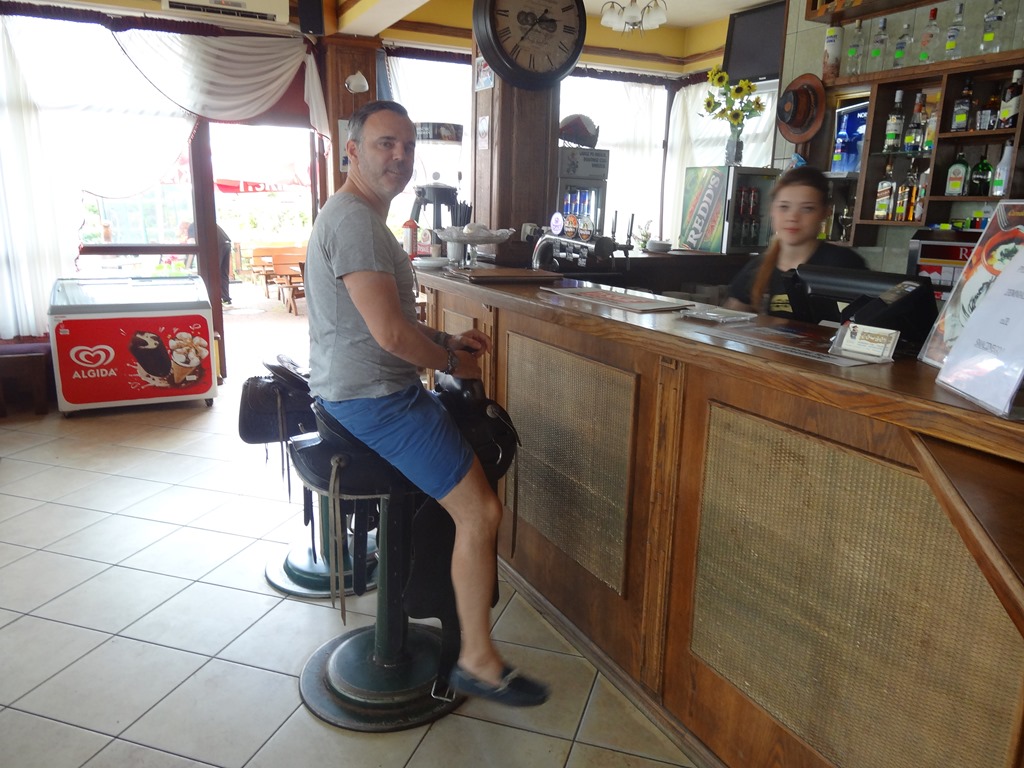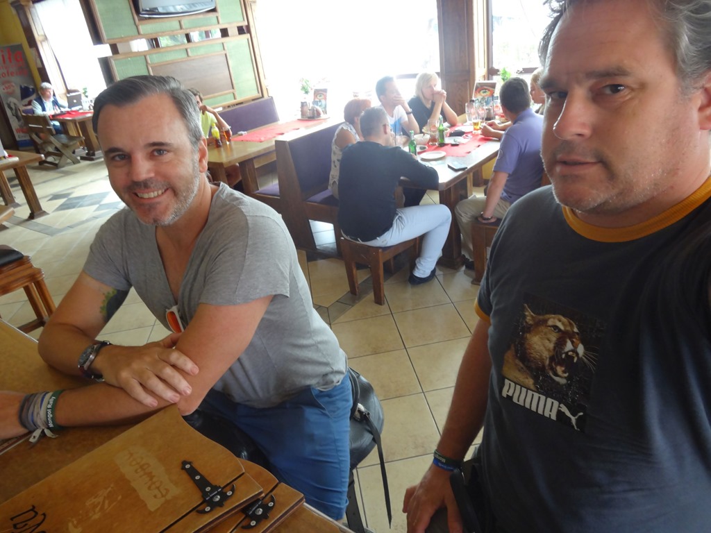 Nachdem wir also Wald und Baustellen hinter uns gelassen hatten, war auch mal Zeit für eine Kaffeepause – Mittagessen ist jetzt nicht mehr – diese Reise ist ja Erfahrung und nicht Vergnügen. Aber Kaffee muss sein, und wo geht das besser als bei den echten Asphalt-Cowboys, den Truckern, die ohne Wertschätzung oder speziellen Glamour all diese Strassen beruflich unter die Räder nehmen. Da muss zwischendurch auch etwas Abwechlsung sein, z.b. eben bei einem Kaffee im Sattel statt in der Führerkabine…