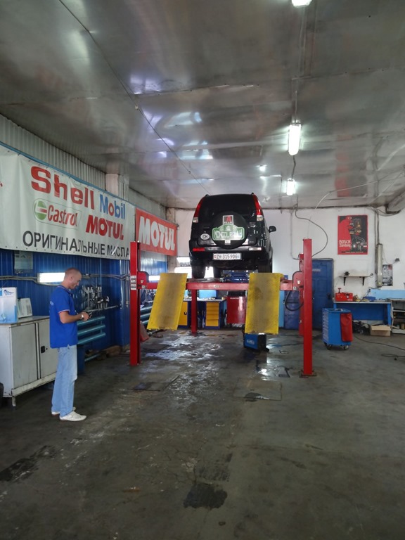 Nach all den Widrigkeiten der Vortage beschlossen wir, unseren Ruhetag vorzuziehen und einmal sauber zu retablieren. Also gefrühstückt und dann dank Datenverbindung mal die Automechen ausgecheckt und den vertrauenswürdigsten ausgewählt und angesteuert. Das klappte perfekt. Die Verständigung danach etwas weniger, aber die wesentlichen Infos konnten trotzdem übermittelt werden, mit dem Resultat, dass Yefgeni eine andere Filiale anrief und uns dorthin lotste, weil er die Werkzeuge oder Teile nicht hatte. Weil allerdings die andere Filiale inmitten von dutzenden von Automechen lag, haben wir dann erst die lokale BMW Filiale nervös gemacht, bevor uns diese unabhängig von Yefgeni zum Schweisser rüberschickte und das war eben der Kollege von Yefgeni. Der hat den Auspuff taxiert, mit Kennerblick erklärt es sei alles “bad”, allerdings habe er auch keinen neuen auf Lager und so werde geschweisst. Wir haben ihn danach noch gebeten dem Auto eine Kurzinspektion zu gönnen und dann unser Münz im Warteraum in den Kaffeautomaten geworfen, Kaffee für ein paar Rappen getrunken, gebloggt und kurz gewartet, denn schon nach ca 45 Min war alles geschweisst und das Auto parat. Leider so schnell, dass ich nicht mal mehr Föteli von drunter machen konnte. Und den kaputten Auspuff haben wir ob all dem Stress auch nicht fotografiert – sah auch übel aus, haben wir nicht gerne angeschaut.